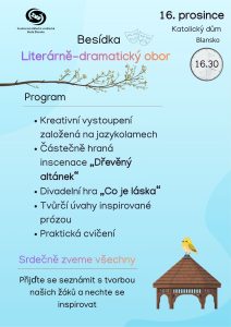 Srdečně vás zveme na besídku žáků literárně-dramatického oboru naší školy.Přijďte si s námi užít předvánoční atmosféru plnou divadla a radosti z tvorby!16. prosince 2025 v 16.30 hodin v Katolickém domě Blansko. Chci vědět více »
