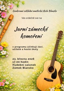 Jarní zámecké komoření Srdečně vás zveme na Jarní zámecké komoření, které se uskuteční v pondělí 23. března 2026 v 17:00 hodin v Hudebním salonku zámku Blansko. Na koncertě vystoupí žáci, pedagogové a hosté školy, kteří představí komorní skladby v příjemné atmosféře zámeckého prostředí. Přijďte si vychutnat podvečer plný hudby a jarní nálady. Těšíme se na […] Chci vědět více »