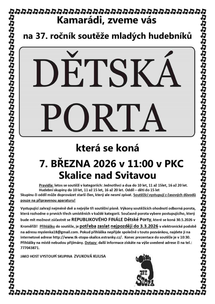 V sobotu 7. 3. 2026 se žáci naší školy zúčastní hudební soutěže Dětská Porta ve Skalici nad Svitavou. Jedná se o tradiční soutěž mladých hudebníků, kde vystupují jednotlivci i hudební skupiny v různých věkových kategoriích a mají možnost představit své hudební dovednosti před odbornou porotou i publikem.