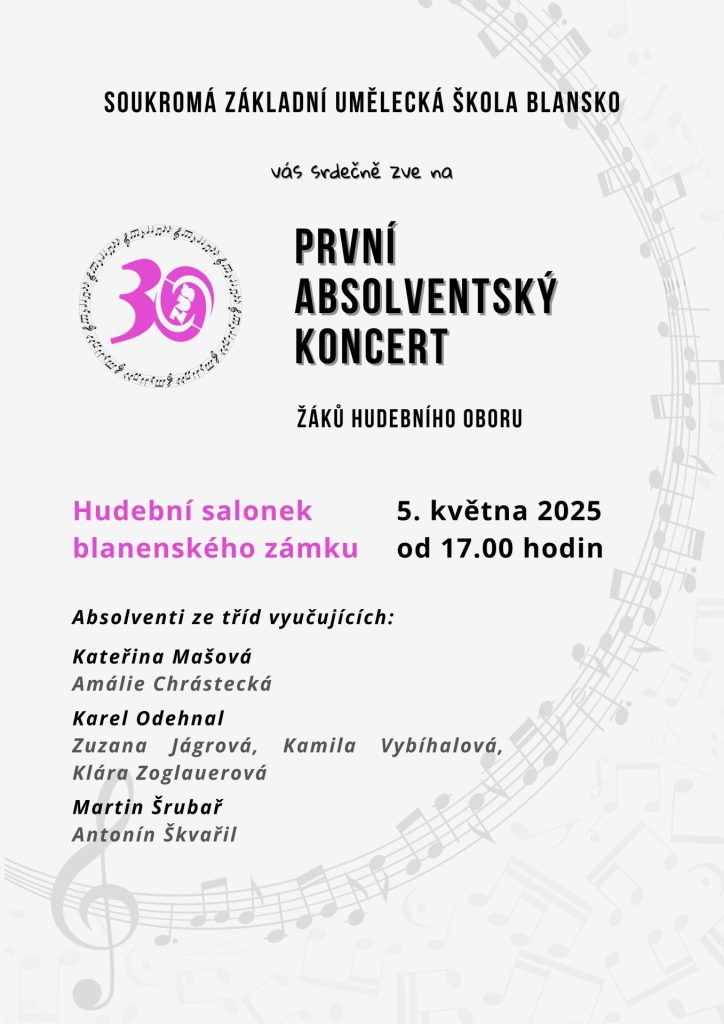 Absolventský koncert žáků ze tříd vyučujících Kateřiny Mašové, Karla Odehnala a Martina Šrubaře proběhne na Zámku Blansko v Hudebním salonku v pondělí 5.5.2025 od 17.00 hodin.