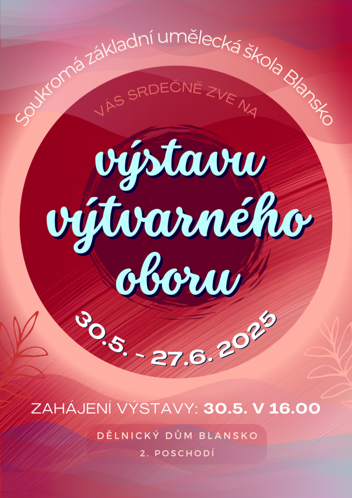 Vernisáž u příležitosti zahájení výstavy prací absolventky výtvarného oboru I. stupně Agáty Voráčové doplněné díly žáků výtvarného oboru školy proběhne v pátek 30.5.2025 v 16.00 hodin ve druhém patře Dělnického domu Blansko.